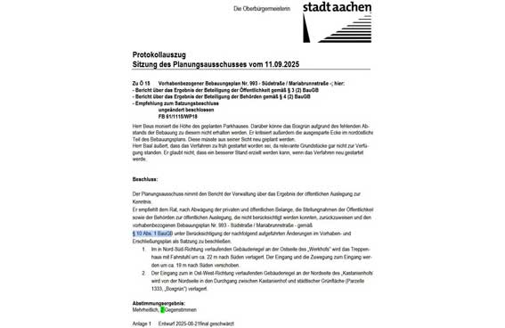 Der B-Plan ist im Planungsausschuss (oder über Ratsinfo Aachen – Sitzung des Planungsausschusses vom 11.09.25) und im Stadtrat beschlossen worden. Die sehr fachlichen Eingaben sind zurückgewiesen oder zur Kenntnis genommen worden. Eine gemeinsame Eingabe von 14 Nachhaltigkeitsorganisation wird ebenfalls nur zur Kenntnis genommen.